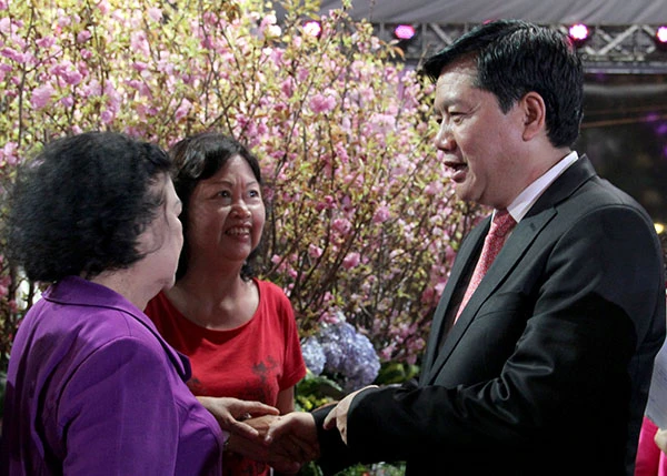 Bí thư Thành ủy TP.HCM Đinh La Thăng trò chuyện với người dân tại lễ hội hoa anh đào TP.HCM, tối 22-4. Ảnh: HOÀNG GIANG