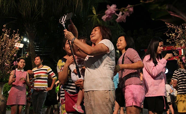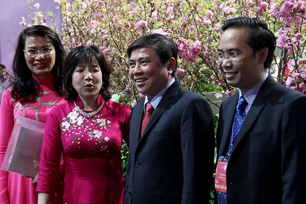 Chủ tịch UBND TP.HCM Nguyễn Thành Phong (giữa), Phó Chủ tịch UBND TP.HCM Nguyễn Thị Thu (bìa trái) chụp ảnh cùng người dân tại buổi khai mạc lễ hội hoa anh đào, tối 22-4. Ảnh: HOÀNG GIANG