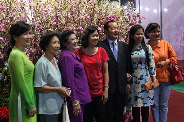 Nguyên Bí thư Thành ủy TP.HCM Lê Thanh Hải vui vẻ chụp hình lưu niệm cùng người dân tại lễ hội hoa anh đào TP.HCM, tối 22-4. Ảnh: HOÀNG GIANG