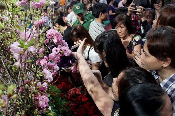Các bạn trẻ thích thú "tự sướng" bên hoa anh đào. Ảnh: HOÀNG GIANG