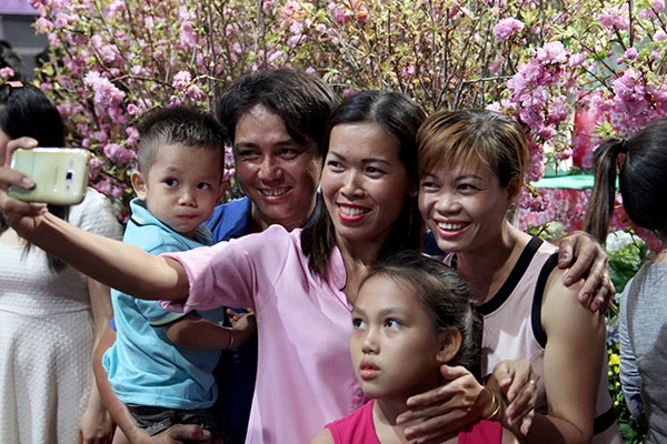 Cả gia đình cùng chụp ảnh lưu niệm bên hoa đào. Ảnh: HOÀNG GIANG