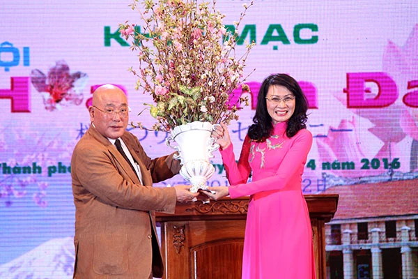 Phó Chủ tịch UBND TP.HCM Nguyễn Thị Thu nhận hoa anh đào do đại diện Nhật Bản tặng. Ảnh: HOÀNG GIANG