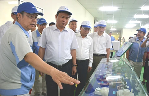 Bí thư Đinh La Thăng thăm nhà máy của Công ty Sankyo tại Khu Công nghệ cao TP.HCM. Ảnh: QUANG HUY