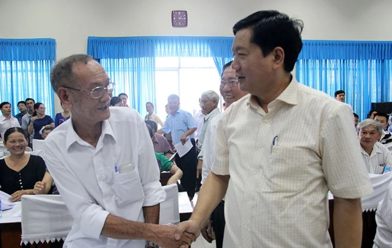 Bí Thư Thành ủy TP.HCM Đinh La Thăng trao đổi với cử tri xã Thới Tam Thôn, huyện Hóc Môn trước buổi tiếp xúc cử tri, chiều 14-5. Ảnh: HOÀNG GIANG