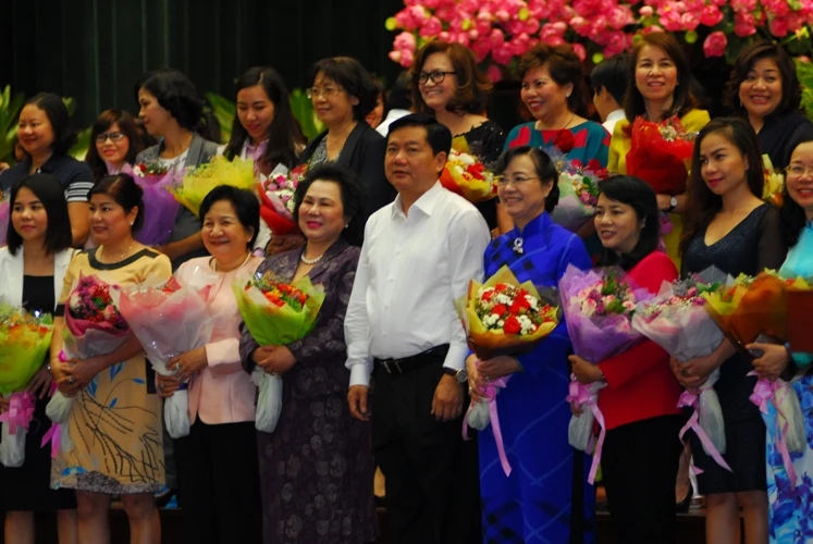 Bí thư Thành ủy TP.HCM Đinh La Thăng, Phó Bí thư Thường trực Thành ủy Tất Thành Cang cùng các lãnh đạo TP đã tặng những bó hoa tươi thắm cho các chị em phụ nữ.