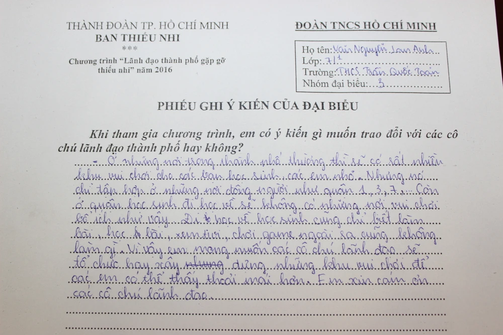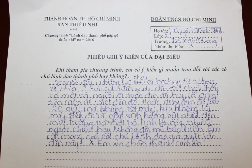 Nhiều vấn đề lớn của TP.HCM cũng được các em quan tâm. Như em Trần Phan Bảo Ngọc, Trường Trung học Nguyễn Du (quận Gò Vấp), phản ánh việc một số CSGT làm việc chưa theo pháp luật, chưa theo trật tự nào cả, có chú bắt phạt dân mà không nói rõ phạt vì lỗi gì cho dân biết. Em Ngọc mong TP chấn chỉnh lại.