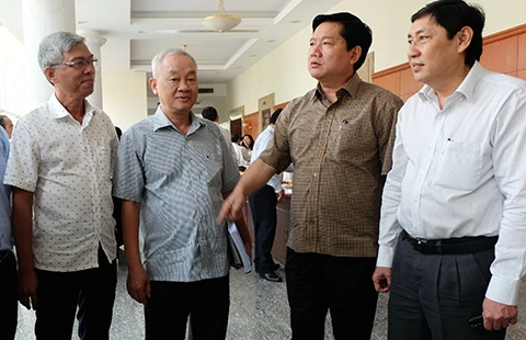Bí thư Thành ủy TP.HCM Đinh La Thăng đang trao đổi với các đại biểu bên lề hội nghị sáng 27-3. Ảnh: VIỆT HOA