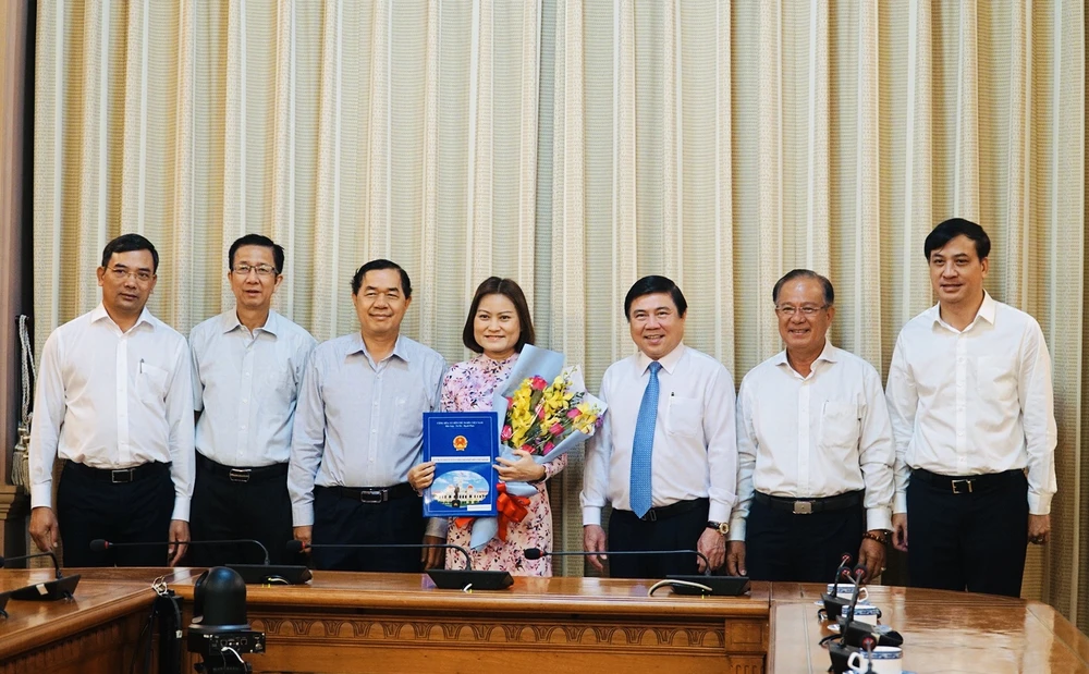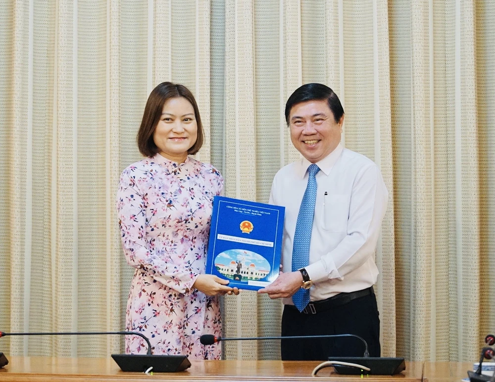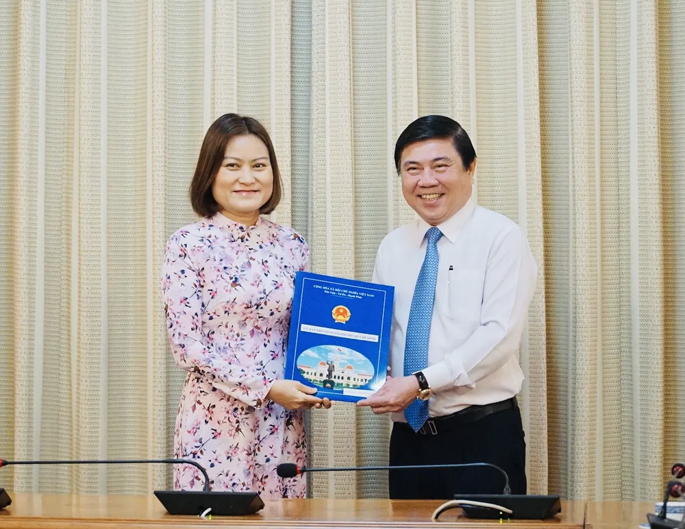 Chủ tịch UBND TP Nguyễn Thành Phong trao quyết định cho bà Nguyễn Thị Thu Vân. Ảnh: VIỆT HOA