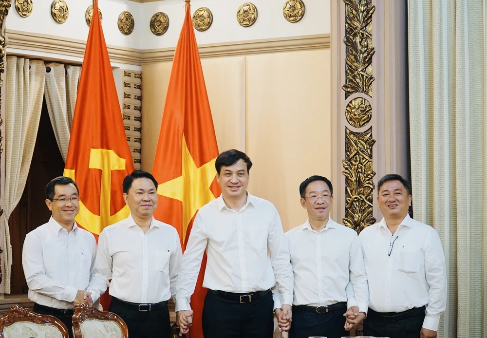 Ban Giám đốc Sở Xây dựng và ông Lê Hòa Bình (giữa), nguyên Giám đốc Sở Xây dựng, hiện là Phó Chủ tịch UBND TP.HCM. Ảnh: VIỆT HOA