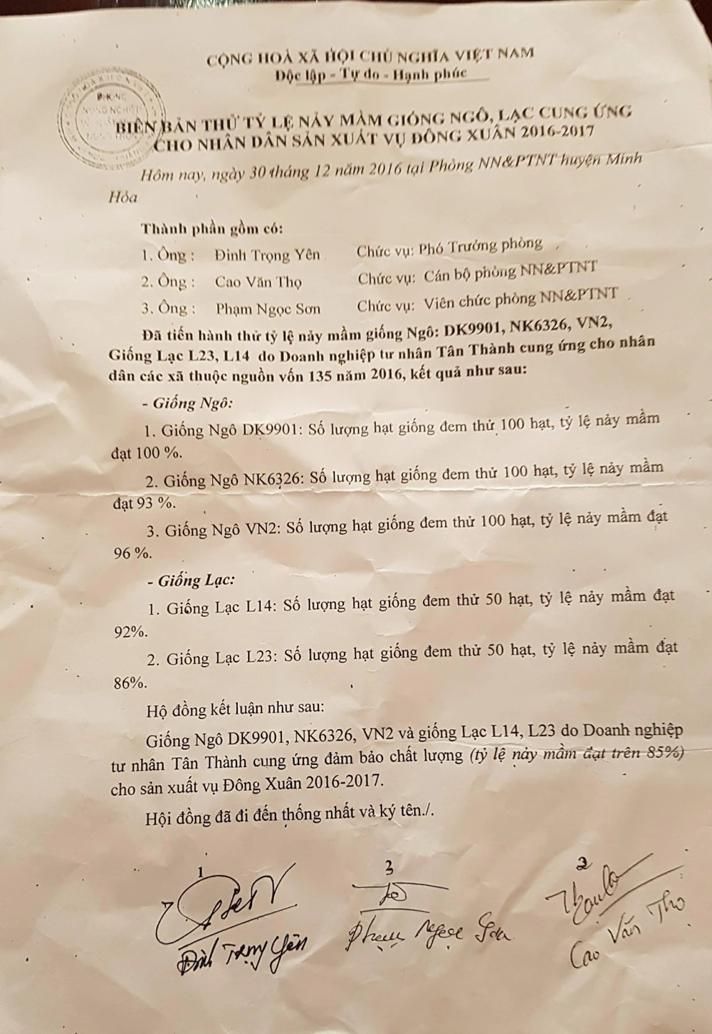 Ông Đinh Trọng Yên, Phó phòng Nông nghiệp huyện Minh Hóa, nói giống của Công ty Tân Thành cung ứng đạt tỉ lệ nảy mầm 100%. Tuy nhiên biên bản mà ông Yên cung cấp (được lập vào ngày 30-12-2016 tại chính phòng lạnh Nông nghiệp huyện) về thử tỉ lệ giống nảy mầm của công ty này chỉ đạt 85%. Biên bản này hoàn toàn không có hồ sơ đi kèm nhật ký thử giống được thử ở đâu.