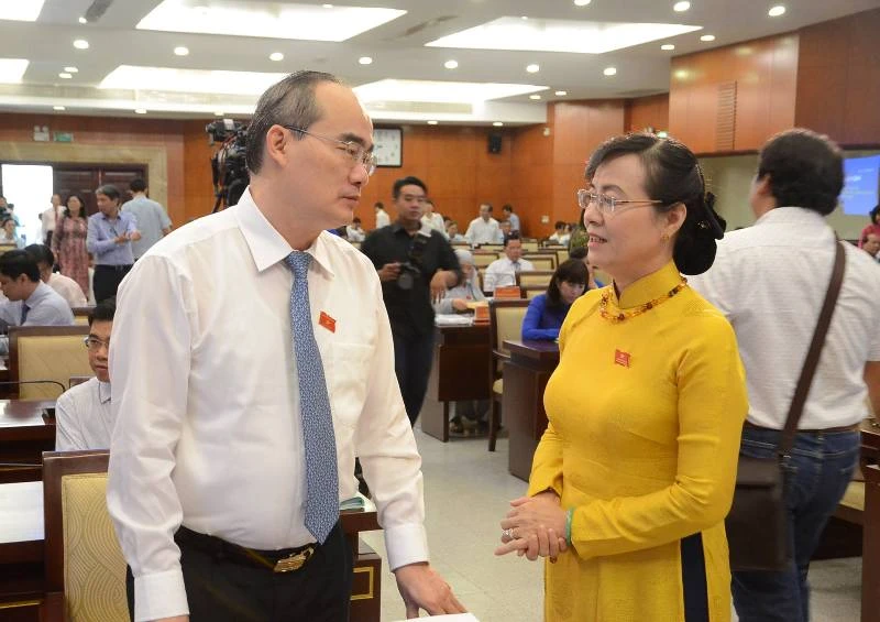Bí thư Nguyễn Thiện Nhân trao đổi với Chủ tịch HĐND TP Nguyễn Thị Quyết Tâm tại kỳ họp. Ảnh: TÁ LÂM