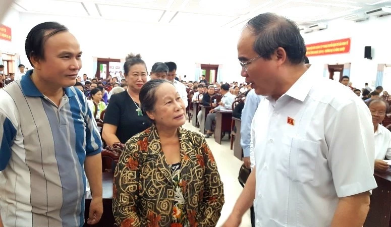 Bí thư Nguyễn Thiện Nhân tiếp xúc với cử tri Bình Chánh. Ảnh: TÁ LÂM
