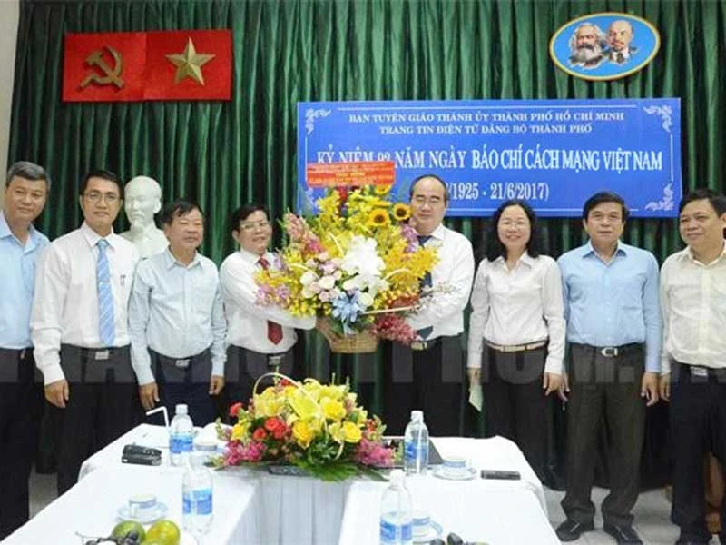 Bí thư Nguyễn Thiện Nhân thăm và chúc mừng trang tin điện tử Đảng bộ TP.HCM. Ảnh: TÁ LÂM