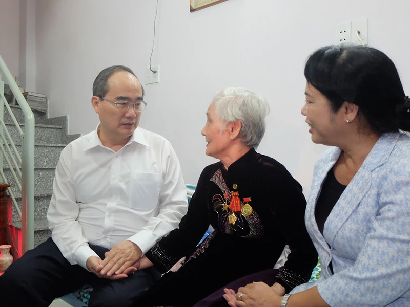 Đến thăm mẹ Việt Nam anh hùng Lê Thị Cách (91 tuổi, phường Phạm Ngũ Lão), ông Nguyễn Thiện Nhân đã ân cần thăm hỏi và thể hiện lòng biết ơn sâu sắc đối với sự cống hiến, hy sinh của mẹ cho sự nghiệp cách mạng của dân tộc. Ông Nhân chúc mẹ Cách mạnh khỏe, sống vui, sống khỏe, trường thọ và luôn là tấm gương sáng cho thế hệ trẻ noi theo.