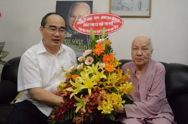Bí thư Thành ủy Nguyễn Thiện Nhân tặng hoa chúc thọ cụ Ngô Thị Huệ. Ảnh: TÁ LÂM