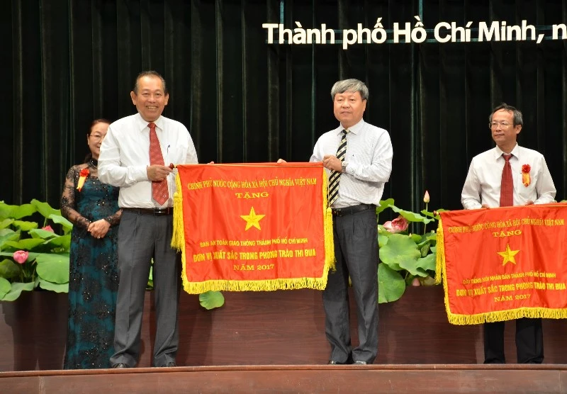 Phó Thủ tướng Thường trực Trương Hòa Bình tặng cờ thi đua cho Ban An toàn giao thông TP.HCM. Ảnh: PHƯƠNG THÙY