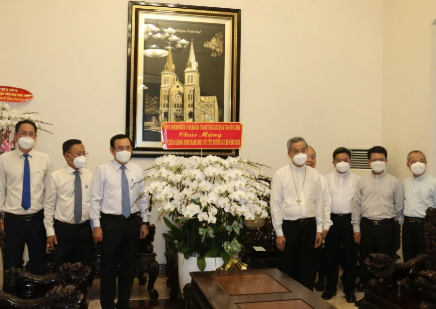 Đoàn lãnh đạo TP.HCM chúc mừng Tòa Tổng Giám mục Tổng Giáo phận TP.HCM nhân lễ Giáng sinh năm 2021 và Tết Dương lịch năm 2022. Ảnh: PHƯƠNG THÙY