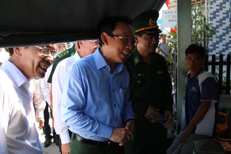 Ông cũng đi bộ trên tuyến đường chính của xã đảo Thạnh An, khảo sát bờ kè chắn sóng, thăm đồn biên phòng.