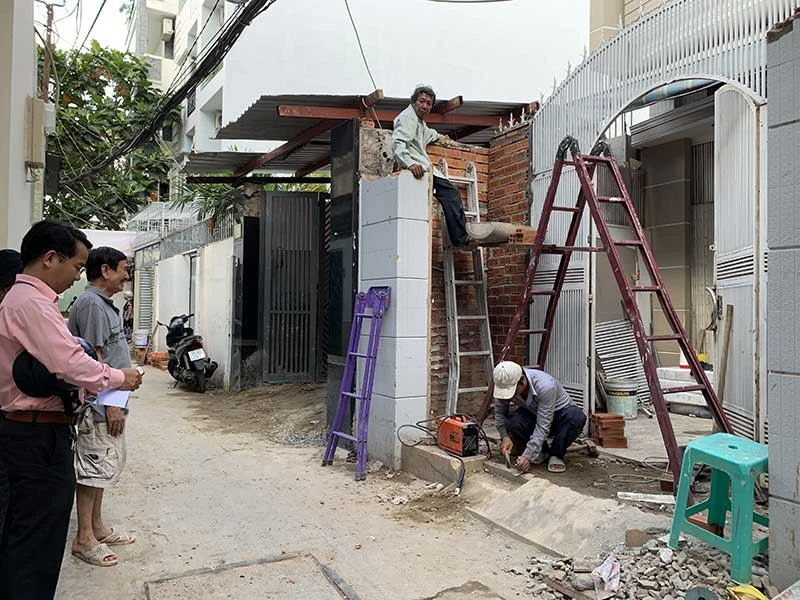 Người dân tại hẻm 359 Lê Văn Sỹ (quận 3) đang dời vị trí cổng nhà mình vào trong để nhường một phần đất mở rộng hẻm. Đây là việc làm ý nghĩa được Bí thư Thành ủy Nguyễn Văn Nên khen ngợi. Ảnh: VIỆT HOA