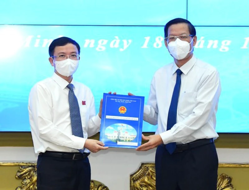 Chủ tịch UBND TP.HCM Phan Văn Mãi trao quyết định cho ông Đặng Quốc Toàn (bên trái). Ảnh: SGGP