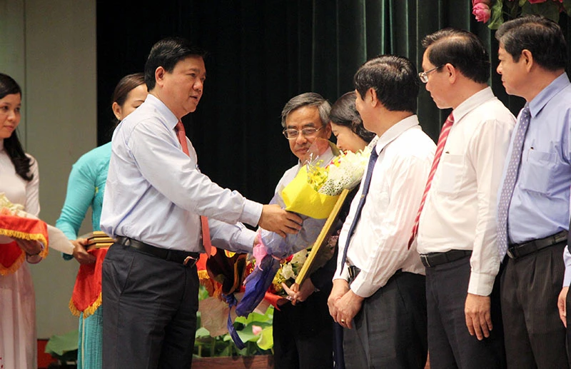 Bí thư Thành ủy TP.HCM Đinh La Thăng tặng hoa và bằng khen cho các tập thể và cá nhân có thành tích xuất sắc trong việc thực hiện Chương trình tạo nguồn quy hoạch cán bộ lãnh đạo, quản lý trẻ tuổi và Chương trình đào tạo thạc sĩ, tiến sĩ. Ảnh: HOÀNG GIANG