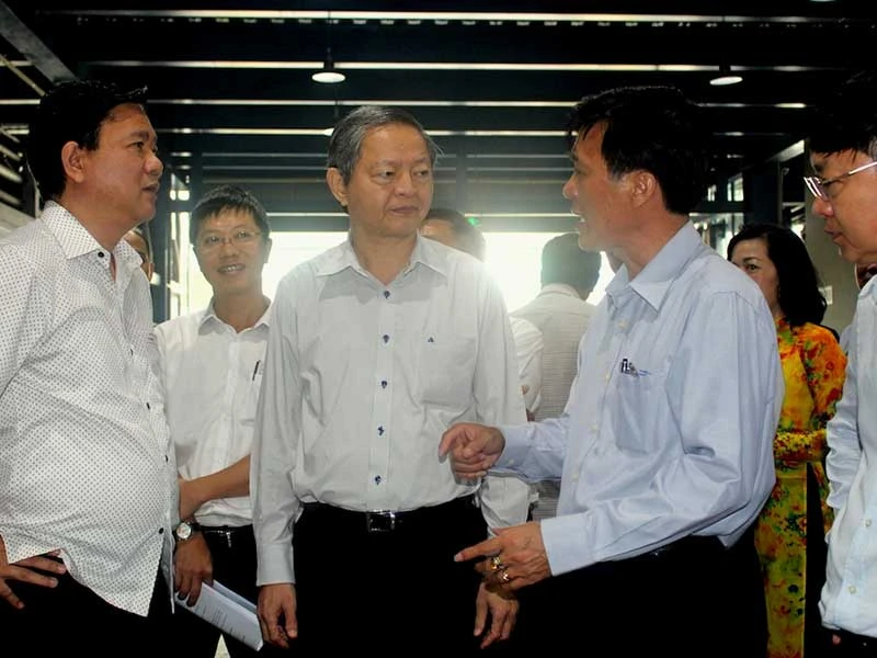 Bí thư Thành ủy TP.HCM Đinh La Thăng (bìa trái) cùng Phó Chủ tịch UBND TP Lê Văn Khoa (giữa) đang trao đổi với lãnh đạo Cảng hàng không Tân Sơn Nhất. Ảnh: HỒNG TRÂM