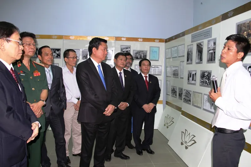 Bí thư Thành ủy Đinh La Thăng thăm quan phòng truyền thống của Trường Đại học Nguyễn Tất Thành. Ảnh: TÁ LÂM