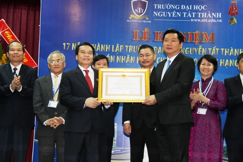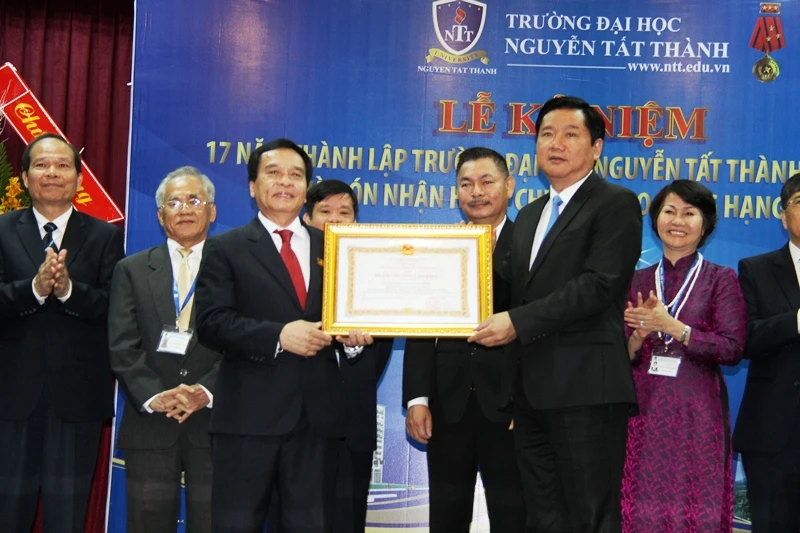 Tại buổi lễ, Bí thư Thành ủy Đinh La Thăng đã thay mặt Đảng và Nhà nước trao Huân chương Lao động hạng Nhất cho tập thể Trường Đại học Nguyễn Tất Thành và cá nhân PGS-TS Nguyễn Mạnh Hùng - Hiệu trưởng Trường Đại học Nguyễn Tất Thành, do Chủ tịch nước tặng.