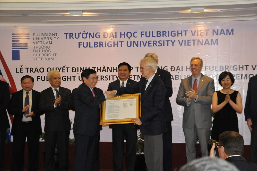 Thay mặt lãnh đạo TP, Chủ tịch UBND TP Nguyễn Thành Phong đã trao quyết định thành lập Trường ĐH Fulbright Việt Nam cho nguyên Thượng nghị sĩ Mỹ Bob Kerry - Chủ tịch Hội đồng tín thác FUV - dưới sự chúng kiến của Ngoại trưởng Mỹ John Kerry và Bí thư Đinh La Thăng.