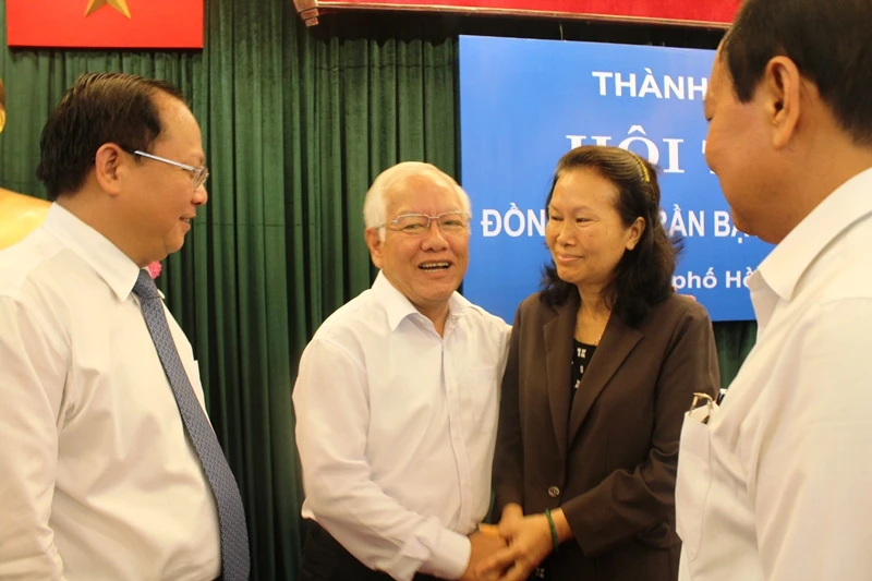 Nguyên Chủ tịch UBND TP.HCM Lê Hoàng Quân và các lãnh đạo TP.HCM trao đổi cùng bà Trần Hồng Ánh - con gái của ông Trần Bạch Đằng. Ảnh: TÁ LÂM