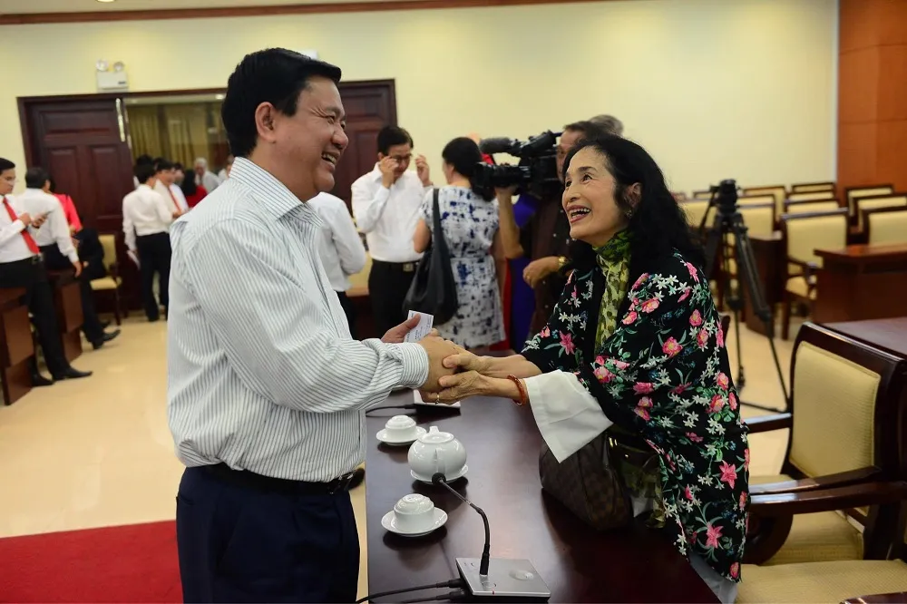 Bí thư Thành ủy TP.HCM Đinh La Thăng trò chuyện với NSND Trà Giang tại buổi lãnh đạo TP gặp gỡ văn nghệ sĩ chiều 5-1. Ảnh: Quỳnh Trang