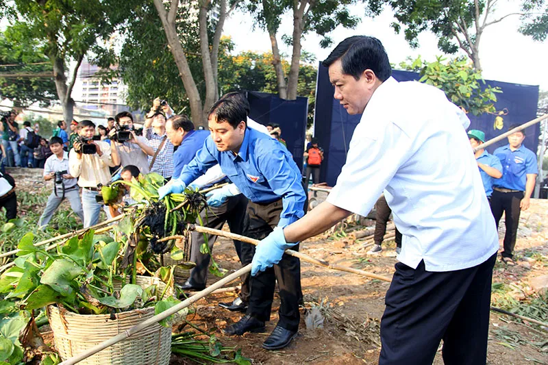 Bí thư Thành ủy TP.HCM Đinh La Thăng đến dự, tặng hoa động viên cho các đơn vị tham gia và đích thân ông cùng các đoàn viên, thanh niên vớt lục bình tại rạch Dừa và rạch Ông Hóa.