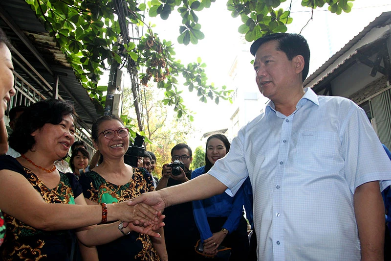 Bí thư Thành ủy Đinh La Thăng thăm hỏi và nhắc nhở bà con quận 2 giữ gìn, làm đẹp khu vực mình sinh sống. Ảnh: HOÀNG GIANG