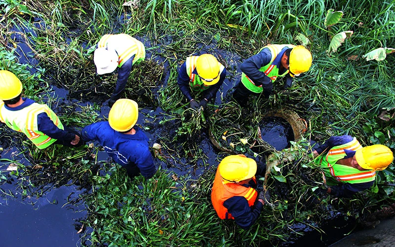 Bí thư Thành ủy TP.HCM Đinh La Thăng cùng đoàn viên, thanh niên dọn rác tại rạch Dừa - rạch Ông Hóa, quận 2. Ảnh: HOÀNG GIANG