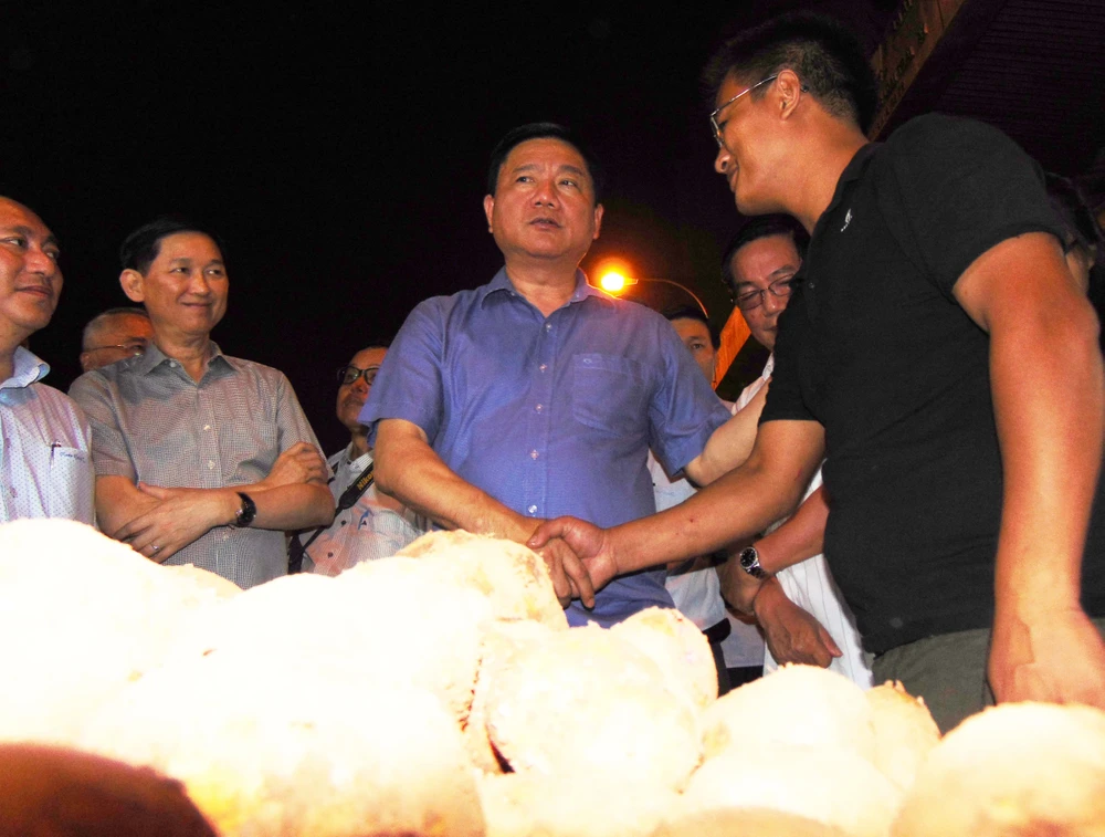 Bí thư Thành ủy TP.HCM (bìa phải) hỏi một tiểu thương chợ đầu mối Thủ Đức nguồn gốc trái cây. Ảnh: LÂM NGỌC