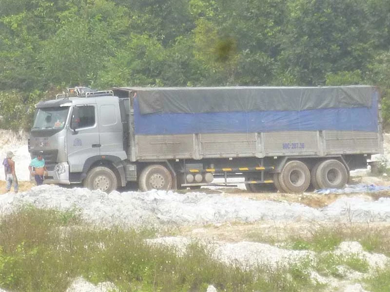 Xe tải vào chở các bao bùn thải đi nơi khác. Ảnh: TD