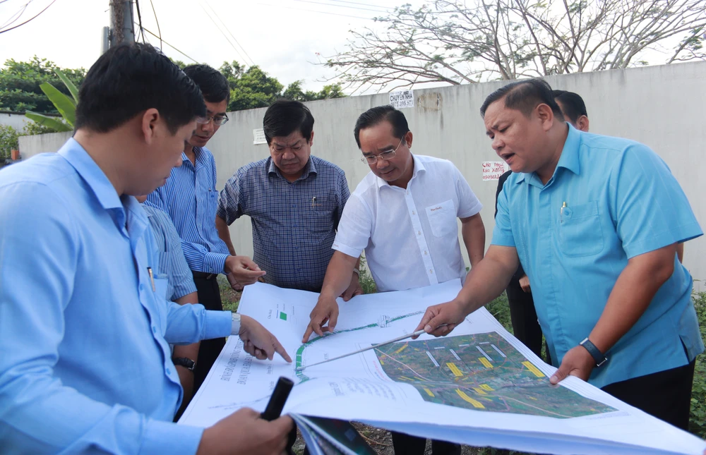 Bí thư tỉnh ủy Nguyễn Văn Được (áo trắng chỉ tay) khảo sát tại tuyến đường dự án Vành đai 3. Ảnh: HUỲNH DU |