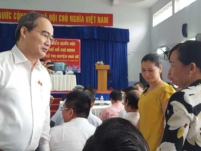 Bí thư Thành ủy TP.HCM Nguyễn Thiện Nhân tiếp xúc với cử tri huyện Nhà Bè. Ảnh: TÁ LÂM