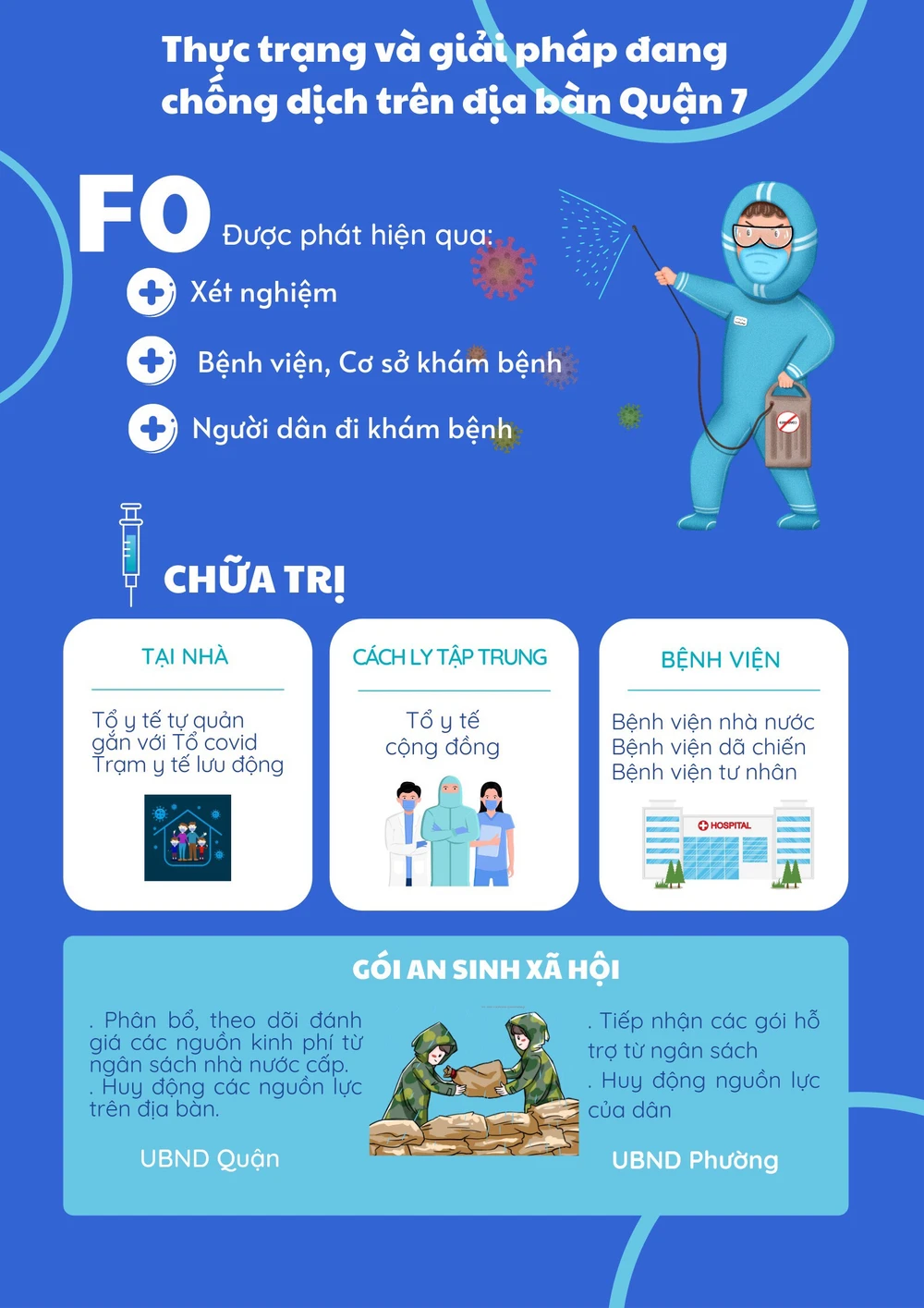 Với các F0 có triệu chứng trung bình, nặng và hồi sức cấp cứu ban đầu, quận đã tổ chức ba cơ sở điều trị, gồm: Bệnh viện quận 7, bệnh viện Đa khoa Tân Hưng và bệnh viện Dã chiến quận 7 số 1. Sức chứa tổng thể là 690 giường, hiện đang điều trị cho 491 người.