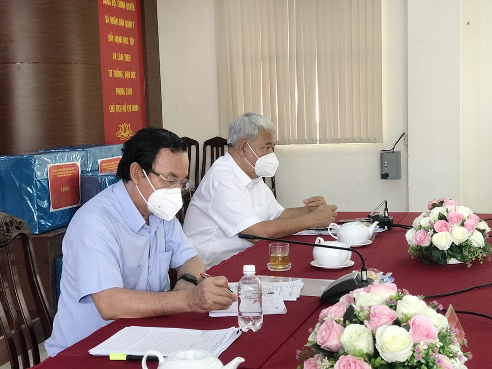 Báo cáo về tình hình dịch, Chủ tịch UBND quận 7 Hoàng Minh Tuấn Anh, cho biết khi dịch bùng phát tại Khu chế xuất Tân Thuận vào tháng 7, quận ngay lập tức đánh giá tình tình hình và sớm áp dụng Chỉ thị 16 về giãn cách xã hội với một số phường có nguy cơ rất cao. Mục tiêu quan trọng nhất của quận là tập trung bảo vệ sinh mạng của người dân, bảo đảm hệ thống y tế hoạt động hiệu quả.