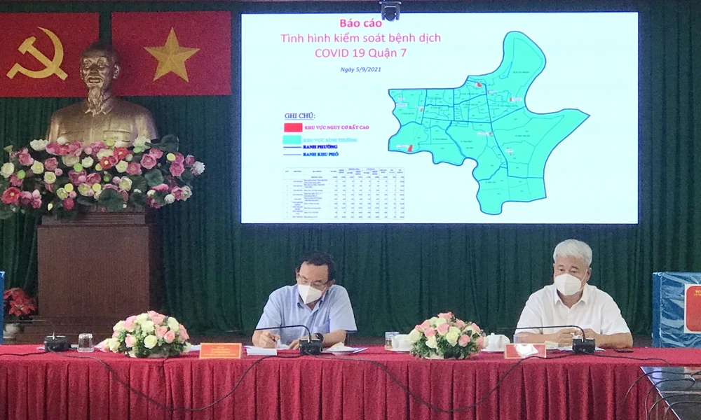 Sáng 5-9, quận 7 (TP.HCM) đã tổ chức buổi báo cáo tình hình kiểm soát dịch trên địa bàn quận. Bí thư Thành ủy TP.HCM Nguyễn Văn Nên đã đến dự sự kiện này.