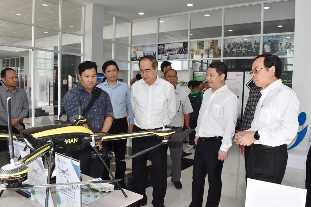 Ông Nguyễn Thiện Nhân, Ủy viên Bộ Chính trị, theo dõi, chỉ đạo Đảng bộ TP.HCM và Bí thư Thành ủy TP.HCM Nguyễn Văn Nên cùng các lãnh đạo TP.HCM tham quan các sản phẩm công nghệ cao trưng bày tại tòa nhà vườn ươm doanh nghiệp công nghệ cao. Ảnh: PHƯƠNG THÙY