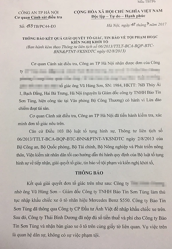 Ngày 12-7-2017, Cơ quan CSĐT Công an TP Hà Nội có văn bản trả lời Công ty TBD với nội dung: “Công ty TBD nhờ ông Vũ Hùng Sơn - Giám đốc Công ty TNHH BTST làm thủ tục nhập khẩu chiếc ô tô nhãn hiệu Mercedes Benz S500. Công ty BTST đã thông qua Công ty CP Đầu tư AV để nhập khẩu chiếc xe này. Sau đó, Công ty TBD đã nộp đủ số tiền thuế và phí cho BTST và nhận bàn giao ô tô trên cùng giấy tờ liên quan. Vụ việc này là quan hệ dân sự, không có sự việc phạm tội nên Cơ quan CSĐT Công an TP Hà Nội đã ra quyết định không khởi tố vụ án hình sự đối với vụ việc này”.