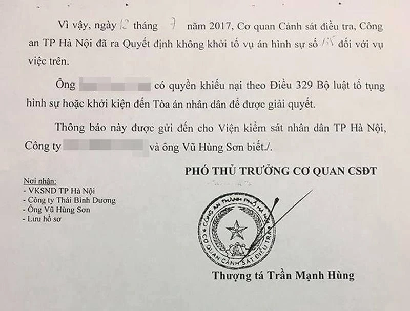 Thông báo giải quyết vụ tố cáo trên của Cơ quan CSĐT Công an TP Hà Nội vào cuối năm 2017. Ảnh: TP
