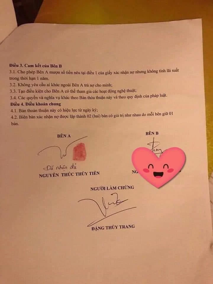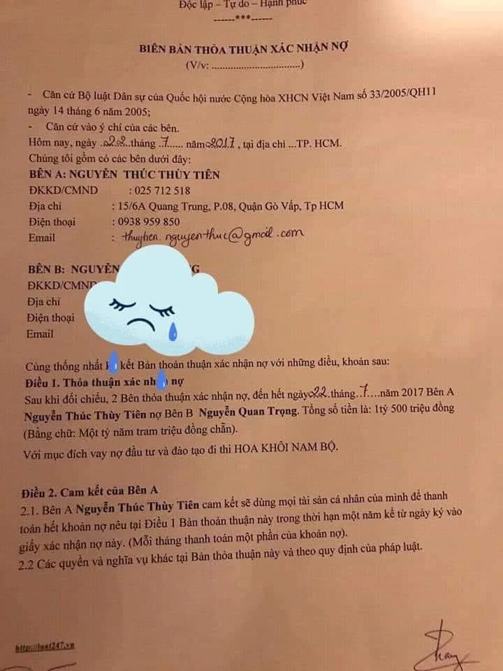 Không chỉ có clip Thùy Tiên xé giấy nợ được tung lên mạng, tờ hợp đồng vay tiền với tên Nguyễn Thúc Thùy Tiên vay 1,5 tỉ đồng để đào tạo thi “Hoa khôi Nam bộ” cũng được tung ra. Rất nhiều cư dân mạng đã có nhiều ý kiến chê trách Thùy Tiên đến mức cô phải khóa facebook. Tuy nhiên, nhiều giờ sau, không chịu nổi áp lực dư luận, Thùy Tiên đã mở facebook cá nhân để đưa lên lời trần tình về vụ việc.