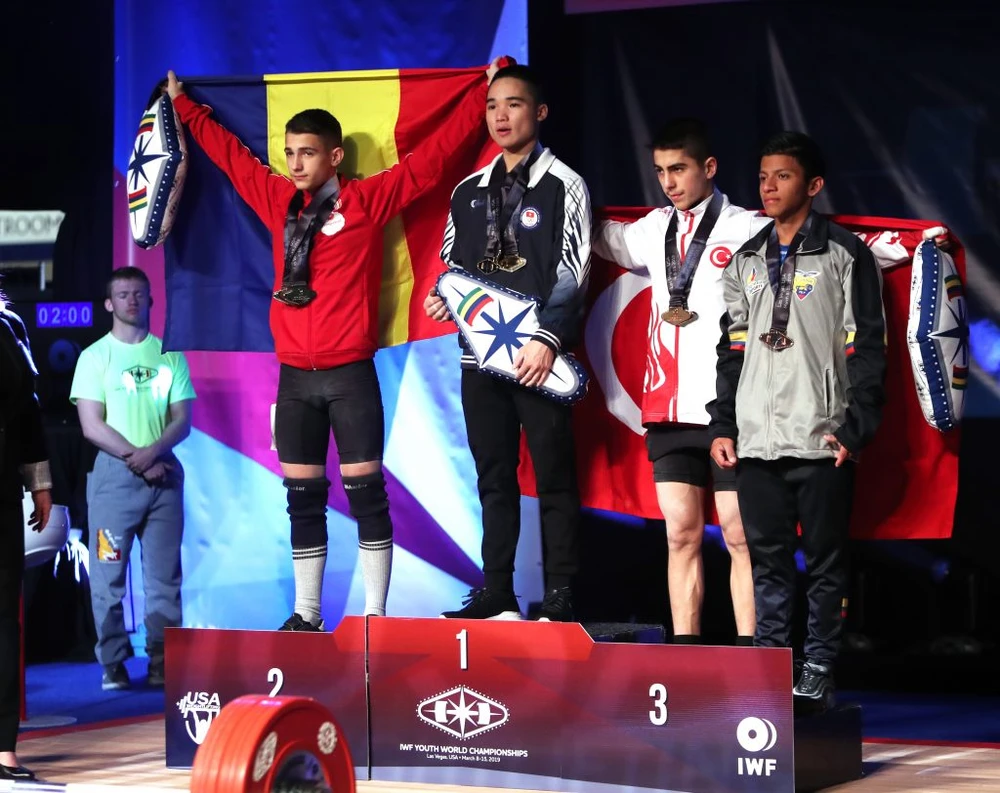 ...và trên bục nhận HCV cử tạ vô địch trẻ thế giới. ẢNH: IWF