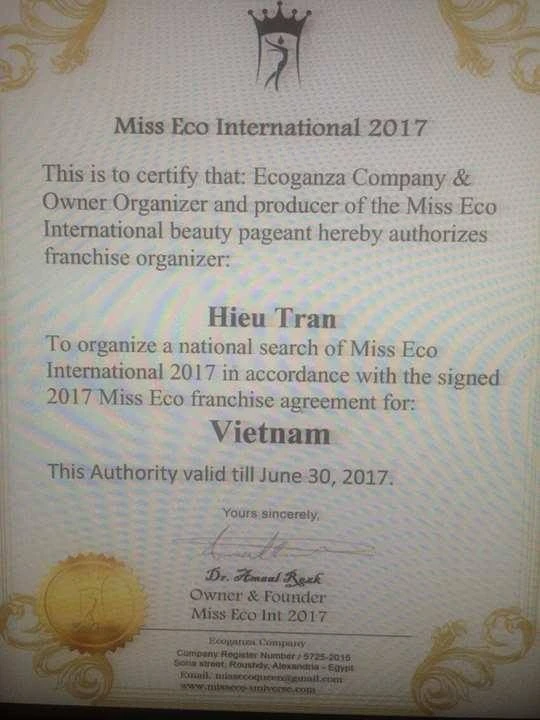 Bản quyền cuộc thi Miss Eco International 2017 cấp cho ông Trần Trọng Hiếu.