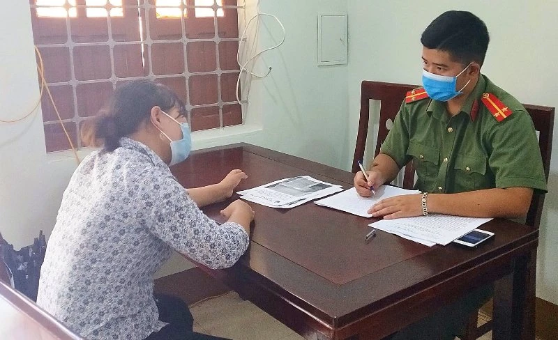 Cán bộ Công an huyện Tân Kỳ làm việc với chị N. Ảnh: CA.