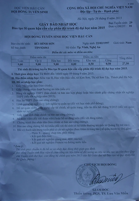Giấy báo nhập học của Trường Học viện Hậu cần.