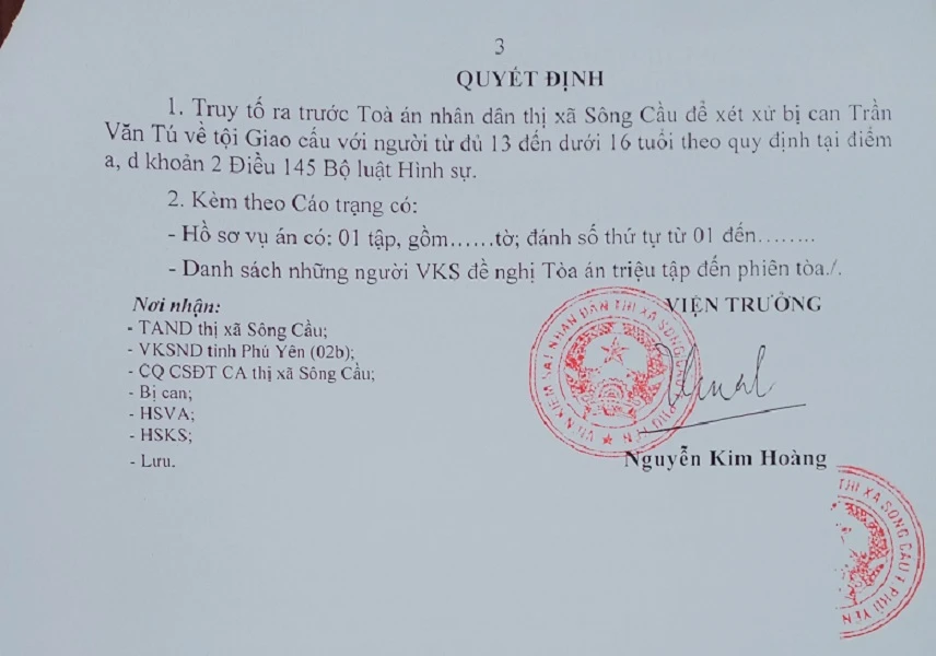 VKSND thị xã Sông Cầu, Phú Yên vừa truy tố bị can Trần Văn Tú (sinh năm 1996, trú xã Xuân Thọ 2, thị xã Sông Cầu) về tội giao cấu với người từ đủ 13 tuổi đến dưới 16 tuổi theo các điểm a, d khoản 2 Điều 145 BLHS.